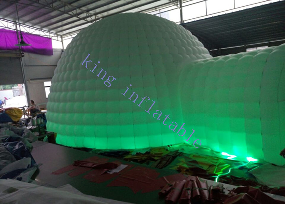 The dome tent is stitching structure,need blower working all the time to provide a constant air.and add a tunnel on the front for people to enter and exit.and material is 210D oxford farbic,it can better to show led light.